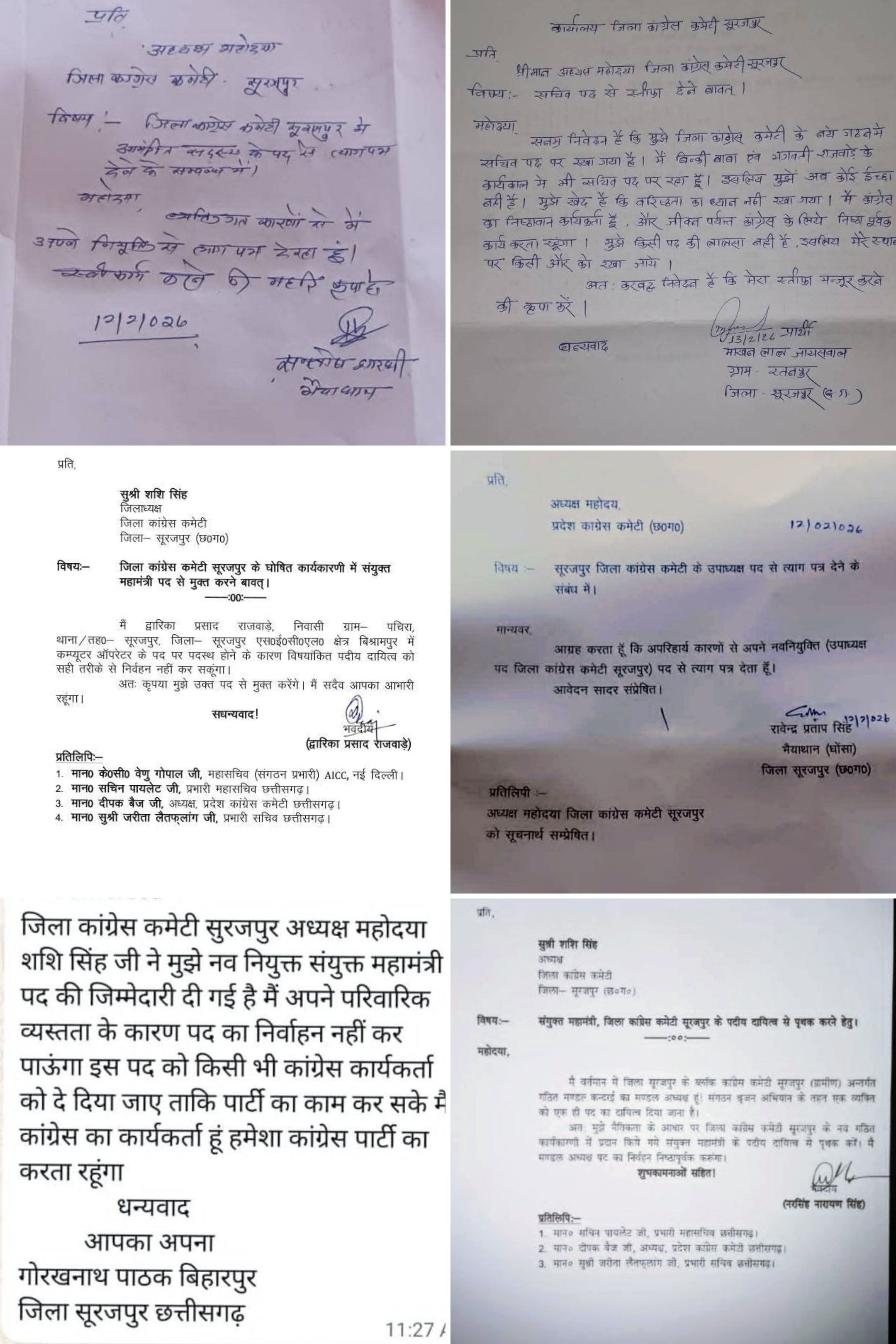 सूरजपुर : छत्तीसगढ़ के सूरजपुर जिले में कांग्रेस पार्टी को एक बड़ा झटका लगा है। लंबे समय से सुलग रही अंतर्कलह अब सामूहिक इस्तीफों के रूप में फूट पड़ी है। जिले के 17 वरिष्ठ पदाधिकारियों ने एक साथ अपने पदों से इस्तीफा दे दिया है, जिसके बाद संगठन में हड़कंप मच गया है। इस्तीफे का यह पत्र सोशल मीडिया पर तेजी से वायरल हो रहा है।