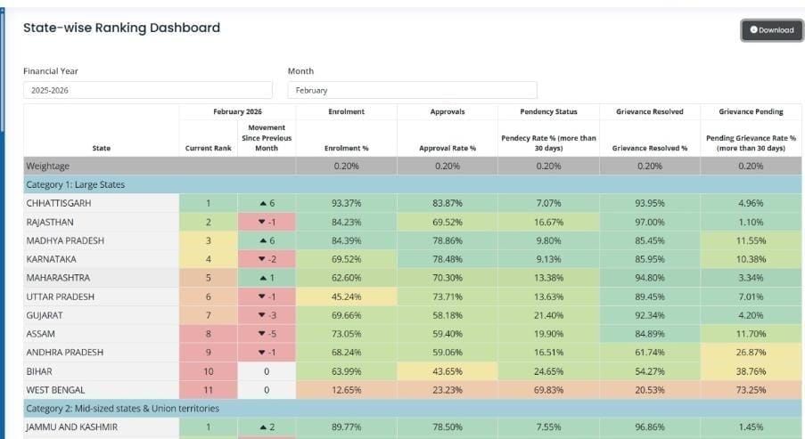 जारी रैंकिंग के अनुसार छत्तीसगढ़ ने 93.37 प्रतिशत नामांकन, 83.87 प्रतिशत स्वीकृति दर और 93.95 प्रतिशत शिकायतों के त्वरित समाधान के साथ उत्कृष्ट प्रदर्शन किया है। वहीं 30 दिनों से अधिक लंबित प्रकरणों की दर मात्र 7.07 प्रतिशत और लंबित शिकायत दर 4.96 प्रतिशत दर्ज की गई है, जो योजना के प्रभावी और पारदर्शी क्रियान्वयन को दर्शाती है। उल्लेखनीय है कि छत्तीसगढ़ ने पिछले माह की तुलना में 6 स्थानों की छलांग लगाकर पहला स्थान प्राप्त किया है।