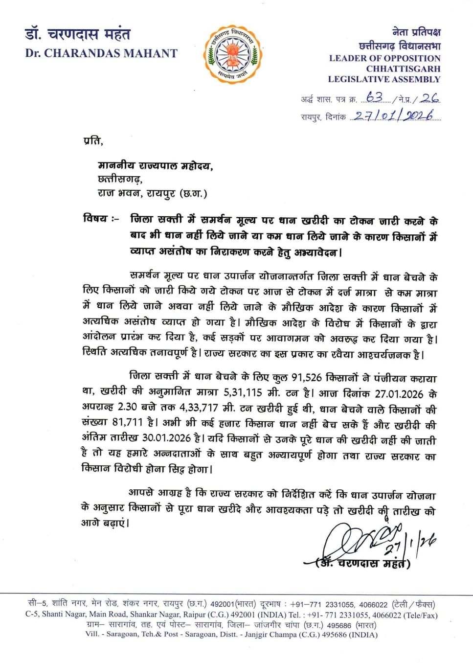 रायपुर : छत्तीसगढ़ में धान खरीदी के अंतिम दौर में व्यवस्थाओं को लेकर राजनीति तेज हो गई है। विधानसभा में नेता प्रतिपक्ष डॉ. चरण दास महंत ने प्रदेश के किसानों की समस्याओं को लेकर राज्यपाल रमेन डेका को एक औपचारिक पत्र लिखा है। इस पत्र में उन्होंने किसानों के बीच व्याप्त 'अफरा-तफरी' के माहौल और धान खरीदी में हो रही कथित अनियमितताओं कि ओर राज्यपाल का ध्यान आकर्षित किया है।