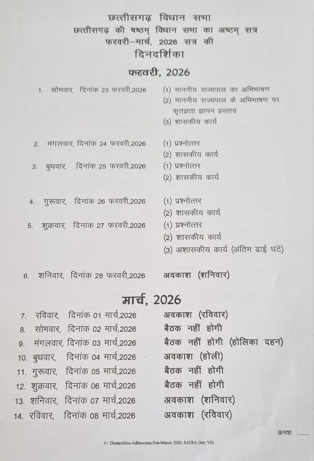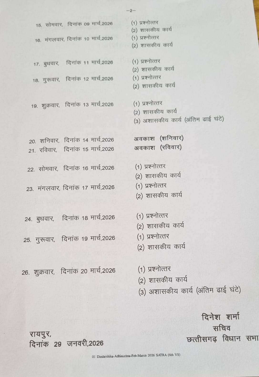 रायपुर: छत्तीसगढ़ की साय सरकार के आगामी वित्तीय वर्ष का लेखा-जोखा जल्द ही प्रदेश के सामने होगा। छत्तीसगढ़ विधानसभा के बजट सत्र की आधिकारिक तिथियां घोषित कर दी गई हैं। यह महत्वपूर्ण सत्र 23 फरवरी 2026 से शुरू होकर 20 मार्च 2026 तक चलेगा।