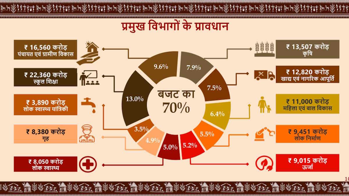 साय सरकार ने बजट का लगभग 70 प्रतिशत हिस्सा सीधे विभागों को आवंटित किया है। इसमें स्कूल शिक्षा विभाग को सबसे बड़ी हिस्सेदारी मिली है, जो सरकार की 'ज्ञान' के प्रति प्रतिबद्धता को दर्शाता है। इसके अलावा लोक निर्माण (5.5%), ऊर्जा (5.2%) और स्वास्थ्य (5%) पर भी विशेष ध्यान दिया गया है।