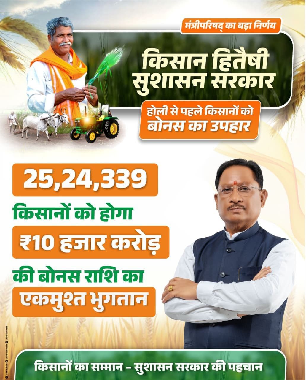 छत्तीसगढ़ कैबिनेट का बड़ा फैसला: होली से पहले 25 लाख किसानों को मिलेगा 10,000 करोड़ का 'बोनस'