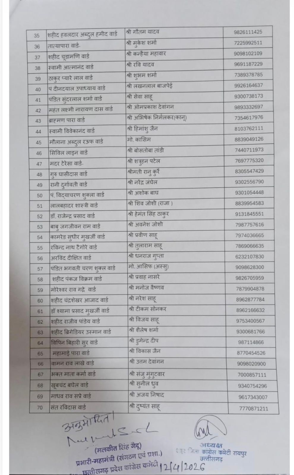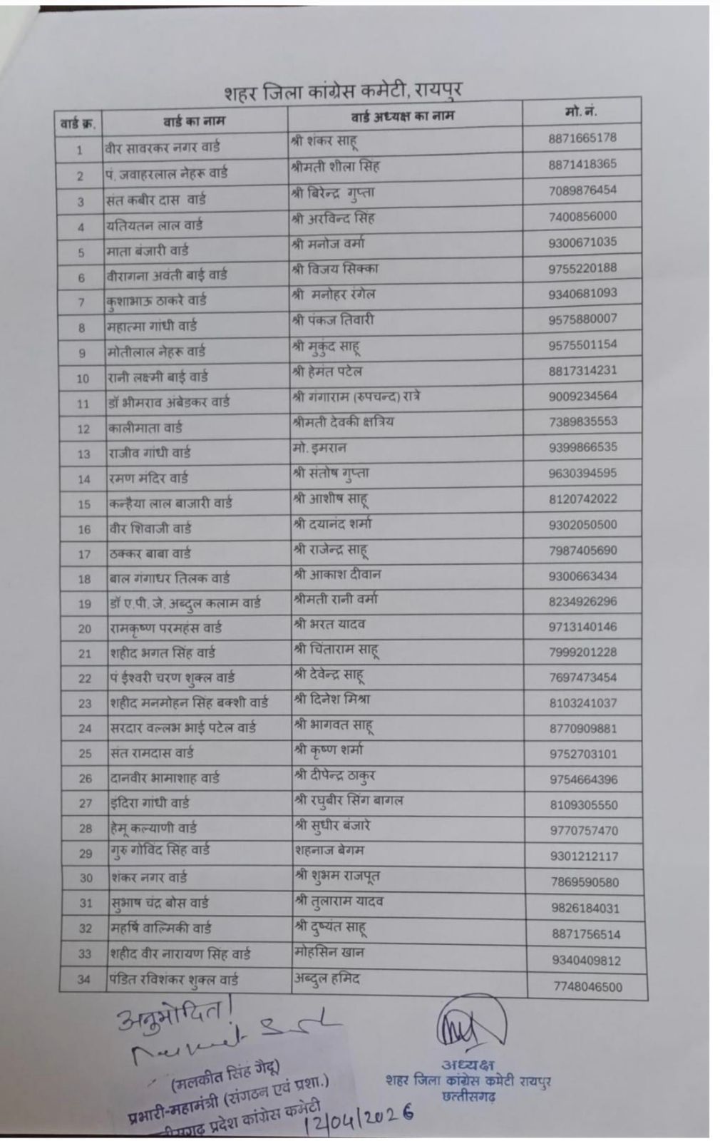 रायपुर ब्रेकिंग: विवादों के बाद शहर कांग्रेस की नई सूची जारी, 70 वार्डों में अध्यक्ष नियुक्त...देखिये किसको - किसको मिला है मौका!