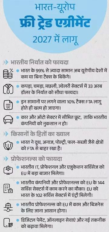 भारत और यूरोपीय यूनियन के बीच हुई ऐतिहासिक ट्रेड डील को ‘मदर ऑफ ऑल डील’ कहा जा रहा है। इस डील से भारतीय निर्यात, MSME, कृषि और सेवा क्षेत्र को बड़ा लाभ मिलेगा। साथ ही यूरोपीय उत्पाद सस्ते होंगे और भारत की वैश्विक रणनीतिक स्थिति और मजबूत होगी।Puja Sahu