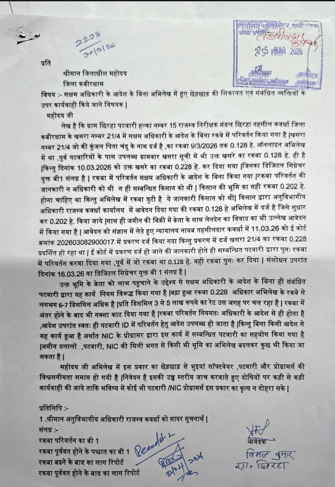 कवर्धा : जिला कबीरधाम के कवर्धा तहसील अंतर्गत ग्राम छिरहा में राजस्व अभिलेखों में कथित छेड़छाड़ का गंभीर मामला सामने आया है। खसरा नंबर 21/4 के रकबे में बिना सक्षम अधिकारी के आदेश के बदलाव किए जाने का आरोप लगा है, जिससे राजस्व विभाग की कार्यप्रणाली पर सवाल खड़े हो गए हैं।