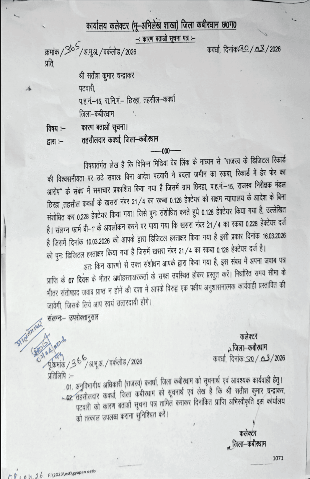 मामले के प्रकाश में आने के बाद तहसीलदार कवर्धा ने संबंधित पटवारी सतीश कुमार चंद्राकर को कारण बताओ नोटिस जारी किया है। नोटिस में 7 दिनों के भीतर जवाब प्रस्तुत करने के निर्देश दिए गए हैं, अन्यथा एकतरफा अनुशासनात्मक कार्रवाई की चेतावनी दी गई है।