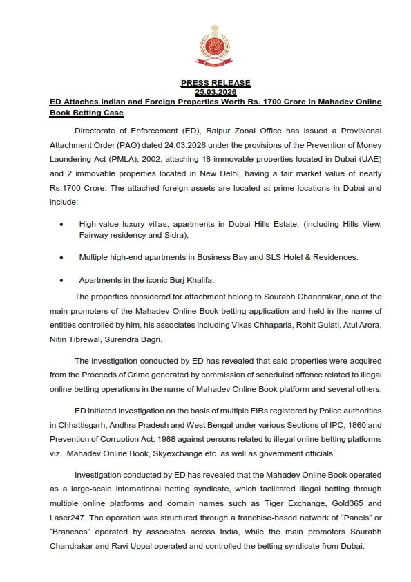 रायपुर/नई दिल्ली : प्रवर्तन निदेशालय (ED) ने महादेव ऑनलाइन सट्टा मामले में अब तक की सबसे बड़ी कार्रवाई करते हुए अंतरराष्ट्रीय स्तर पर सिंडिकेट की कमर तोड़ दी है। जांच एजेंसी ने मास्टरमाइंड सौरभ चंद्राकर और उसके सहयोगियों की देश और विदेश में स्थित करीब ₹1700 करोड़ की अचल संपत्तियों को अटैच कर लिया है।