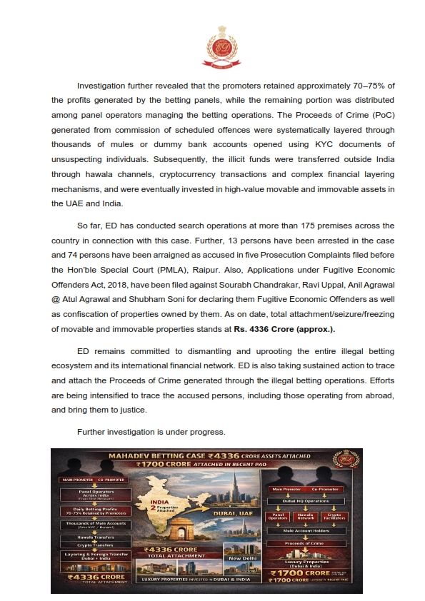 ED के सूत्रों के मुताबिक, सौरभ चंद्राकर और उसके सहयोगियों ने एक ऐसा नेटवर्क तैयार किया था जो भारत के मध्यम वर्ग को सट्टे के जाल में फंसाकर अरबों रुपये लूट रहा था। एजेंसी अब इस पूरे 'इंटरनेशनल सिंडिकेट' को जड़ से खत्म करने के लिए विदेशी जांच एजेंसियों के साथ मिलकर काम कर रही है। "यह कार्रवाई केवल शुरुआत है। अवैध सट्टेबाजी से अर्जित पाई-पाई का हिसाब लिया जाएगा और विदेश में बैठी मछलियों को भी कानून के दायरे में लाया जाएगा।" — प्रवर्तन निदेशालय