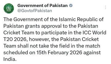 "पाकिस्तान की सरकार राष्ट्रीय टीम को टी-20 वर्ल्ड कप 2026 में खेलने की मंजूरी देती है, लेकिन टीम 15 फरवरी को भारत के खिलाफ मैच में मैदान पर नहीं उतरेगी।"